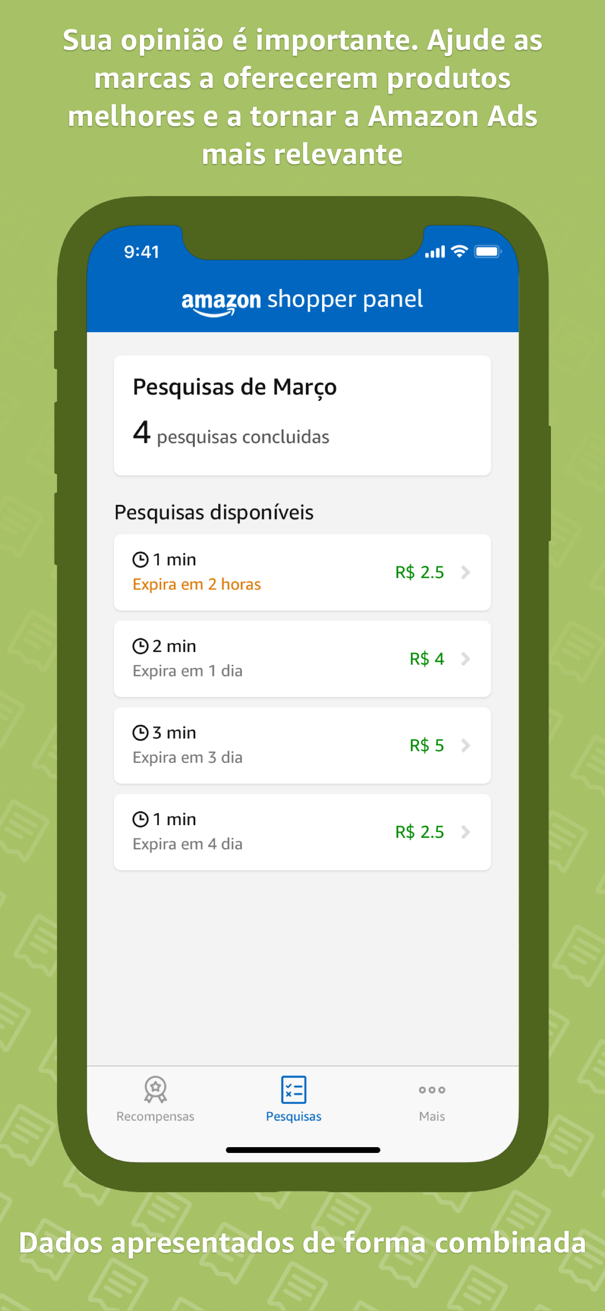 A participação no Amazon Shopper Panel é voluntária e os participantes podem parar de usar o aplicativo e responder às perguntas da pesquisa a qualquer momento. A Amazon só recebe informações que os participantes optam explicitamente por compartilhar por meio do Shopper Panel, como respostas de pesquisas.