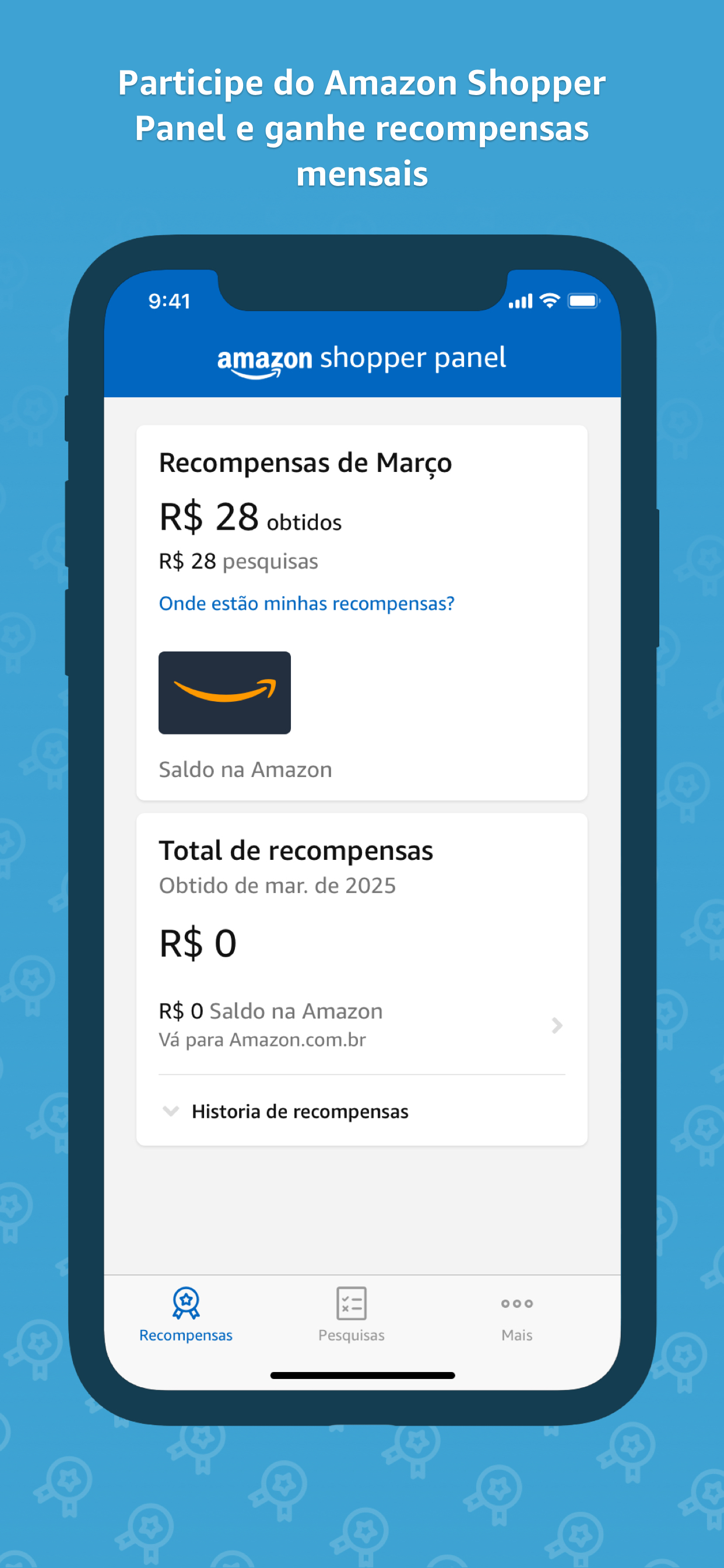 O Amazon Shopper Panel é um programa opcional, somente para convidados, no qual os participantes podem ganhar recompensas mensais respondendo a pesquisas curtas sobre sua opinião a respeito de marcas ou produtos que possam ser do seu interesse.